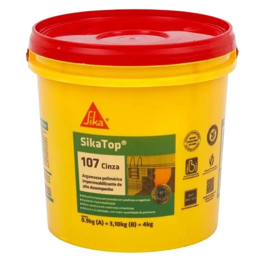SikaTop® 107 é um revestimento semi-flexível, impermeabilizante e protetor, bicomponente, à base de cimento, areias selecionadas para uso em concreto, argamassa ou alvenaria com excelente fixação e impermeabilidade. É necessário estar pronto para o uso, bastando misturar) os componentes A (líquido e B (pó). – Aplicação fácil, podendo ser aplicada como pintura. – Excelente impermeabilidade. Alta fixação em substratos cimentícios e alvenaria. – Não deve ser usado com finalidade estética. – Reduzir o processo de carbonatação por formação de barreira. – Não é corrosivo, tóxico ou inflamável. – Pronto para o uso, bastando homogeneizar os dois componentes. – Resistente a características hidrostáticas positivas e negativas. – Pode ser aplicado por análise. SikaTop® 107 pode ser aplicado sobre concreto, argamassa e alvenaria para impermeabilização de: – Caixas de água e reservatórios, poços de elevadores, tanques e cisternas. – Umidade de rodapé, paredes internas de construções como silos, armazéns, depósitos e residências. – Para evitar a entrada de umidade em subsolos, baldrames e galerias de águas pluviais e servidas. – Pisos e paredes de “áreas frias”: banheiros, lavanderias, cozinhas e paredes em contato direto com o solo. Consumo aproximado: 1kg/m² por demão cozinhas e paredes em contato direto com o solo. Consumo aproximado: 1kg/m² por demão cozinhas e paredes em contato direto com o solo. Consumo aproximado: 1kg/m² por demão O consumo e o número de demãos varia conforme a aplicação